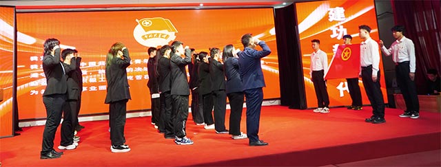 在鲜艳的团旗下,朱道平老师带领新团员举行了庄严的入团宣誓仪式。