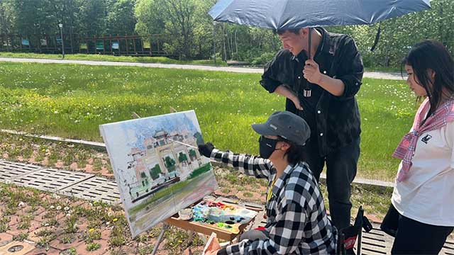 ▲三江美院学生在现场专注写生绘画