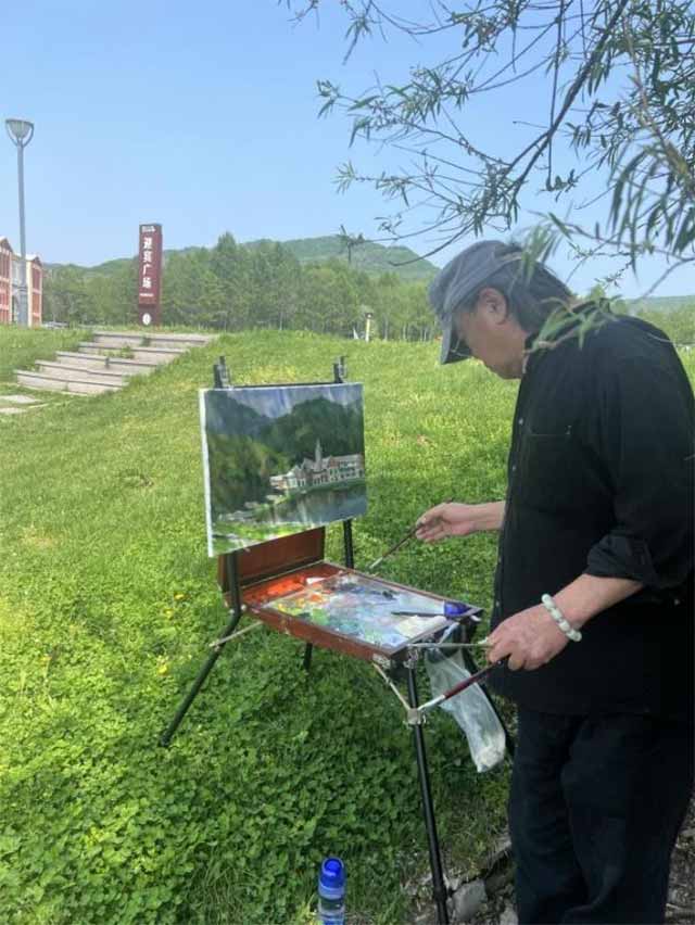 作为油画协会主席,画家刘恒伟在写生时展现出深厚的艺术积淀与创新魄力。他支起画架,目光如炬地凝视着眼前起伏的山峦与金龙山特色建筑,将构图、光影与色彩在脑海中反复推演。他时而后退几步,眯起眼睛审视画面的整体关系;时而疾步向前,用笔果断塑造山体的肌理。“金龙山的每一寸土地都充满生命力,笔触必须跟随自然的节奏跃动。”刘恒伟坦言,创作过程中,他力求打破传统风景油画的桎梏,通过大胆的色彩碰撞与块面重组,让画面既保留自然本真,又彰显现代艺术的张力。