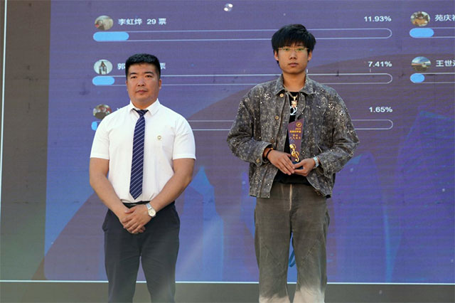 紧接着,活动进入互动性十足的“最佳人气票”环节。主持人一声号召,现场同学纷纷扫码投票,为心仪选手助威。倒计时“5、4、3、2、1”的呐喊瞬间点燃紧张气氛。最终,王梓澳以超高人气荣膺“最佳人气歌手”,学生处副处长张宇为其颁发证书,现场掌声雷动。这一环节成功打破舞台界限,让每位观众化身“造星者”,生动展现了校园音乐的全员参与魅力,青春光芒在热烈互动中更加闪耀。