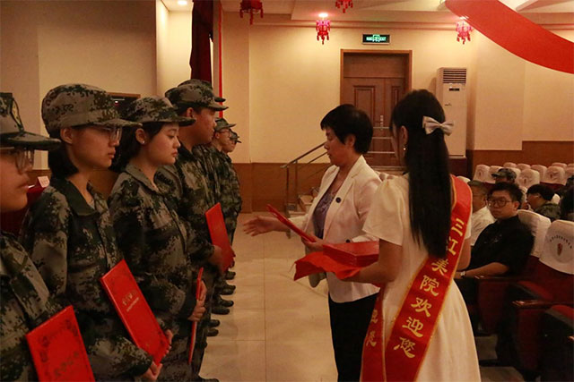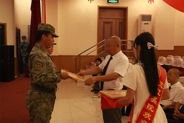 北京教学实习基地安全保障部主任赵秀玲为“军训标兵”颁奖。获奖证书不仅是对过去一周努力与付出的肯定,更是对同学们奋勇争先、不屈不挠的军人意志、不抛弃不放弃精神的褒奖。