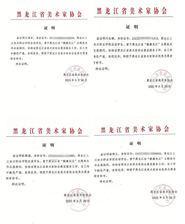 九月龙江,艺韵流淌,廉风拂面。在9月17日至30日举办的首届黑龙江省“勤廉龙江”美术作品展览期间,黑龙江三江美术职业学院艺术疗愈与人工智能学院曲博文、刘金鹏、欧锡涵、王海宇四名学子,以省美术家协会志愿服务团队成员的身份,深度融入这一艺术与精神交融的盛会。他们以青春之名,赴时代之约,用超过80小时的坚守与热忱,在服务中诠释责任,在奉献中磨砺成长,荣获“优秀志愿者”称号,生动演绎了“教学出真知、实践塑人格”的育人理念。