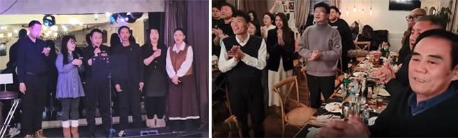 ▲俄赤塔晚宴上,校领导与留俄教师同唱《歌唱祖国》