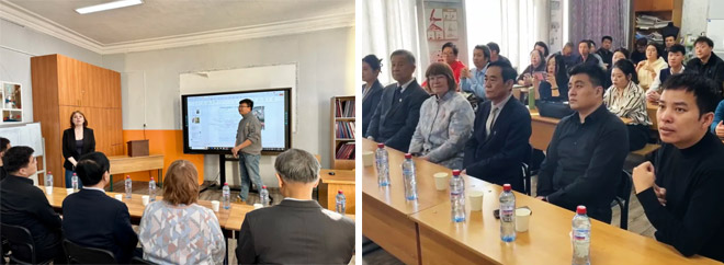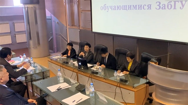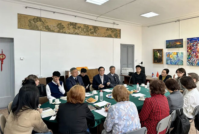 ▲驻伊尔库茨克总领事刘渝会见王英海校长及在俄中国硕博留学生