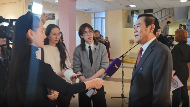 ▲王英海校长接受俄罗斯后贝加尔边疆区和赤塔市电视台采访