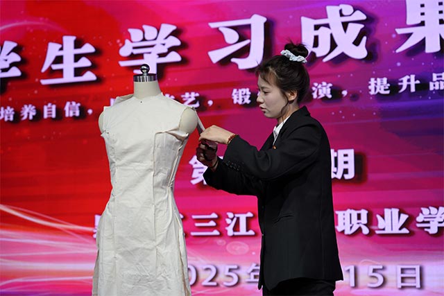 23影视动画服装班卢滢萦同学打破常规汇报模式,现场演示旗袍平面裁剪制作。,他动作行云流水,精准把控每一处细节,将专业技法转化为灵动的制作过程,引得现场师生频频赞叹,直观展现出扎实的专业功底。卢滢萦同学同样以丰富多元的成果大放异彩。其手绘效果图构思精妙,立体裁剪与平面裁剪展现深厚技术积淀,面料改造大胆创新,成衣作品更是将创意与工艺完美融合。从设计图纸到实物呈现,每一个环节都彰显出她对专业的执着追求与对生活的无限热忱,充分诠释了新时代服装专业学子的匠心与活力。
