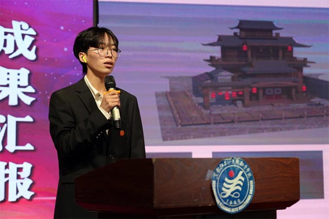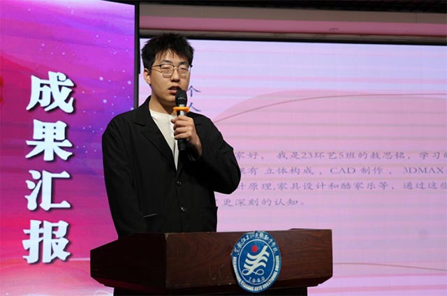 第八位汇报的是24环艺1班的史金阁同学,他是本期成果汇报中,唯一登台汇报的大一学生,入校近一年来,他以卓越表现交出亮眼答卷。汇报现场,其平面构成、色彩构成作品构思新颖,建筑速写笔触流畅,室内效果图细节精湛,展现出扎实的专业素养。值得一提的是,史金阁已斩获多项荣誉:黑龙江省优秀设计新星奖、学校寒假作业作品二等奖,更在全国美育教学成果展中荣获学生组二等奖。这位设计新锐以实力证明潜力,为低年级学子树立榜样,也让人对其未来发展充满期待。
