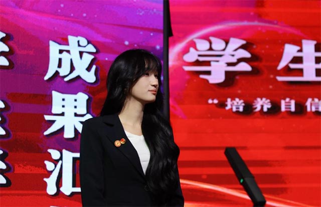 首先汇报的是设计与科技融合学院23级数传1班的徐艺瑄同学,在汇报中先致谢学校与老师,着重讲述了学校对于他自身发展的关键作用。她大二时,通过松峰山实践教学项目他将搁置的剪纸技能重新拾起,与伙伴成立纸绘剪纸工作室,还在老师鼓励下运营短视频账号。通过在校学习的视频拍摄课程、新媒体营销知识等手段,账号曾出百万浏览量的爆款短视频,现浏览量稳定在几万。