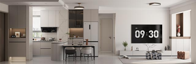 暑期期间,她在指导教师宿宝丽的引荐下,接触并加入哈尔滨星筑装饰工程有限公司,开启了实习与兼职相结合的实践历程。其间,她参与完成了一项以“功能与美学共生”为核心的现代简约风格户型设计。厨房空间兼顾高效操作与社交属性;客厅提供“雅致温馨”与“极简大气”两种风格选择;主卧注重营造舒适静谧的氛围,次卧则以多功能设计贴合青少年学习与成长需求。整体动线流畅,材质语言简约而富有质感。