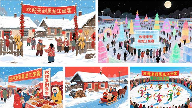 作品紧扣黑龙江特色,“农家特色风貌”绘冬雪农舍、晾晒作物,展现村民好客之情;“冰雪文化之旅”以冰雪大世界冰灯、滑雪场为元素,彰显冰雪魅力;“早市烟火生活”还原热闹早市与特色小吃,尽显市井活力;“儿时娱乐记忆”定格堆雪人、抽冰尜等童趣场景;“黑土民俗艺术”融入二人转、东北大秧歌元素,传递热情豪迈。王昱翔致谢学校与导师后,未来计划深耕地域文化,提升AI、动画软件技能,积累实践经验。