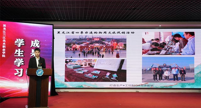 艺术疗愈与人工智能学院24级美教班曲博文,以“寒地文创绘本龙江”为主题,汇报了黑龙江省四季非遗购物周文化衍生品项目落地成果。项目在孙作范教授与郭勇主任指导下开展,期间与全国14个省、2个直辖市的60位非遗代表性传承人及相关企业合作,同步售卖四季非遗作品,探索“非遗工艺+地域生活场景”的文创转化路径,最终实现项目口碑与销量双丰收。