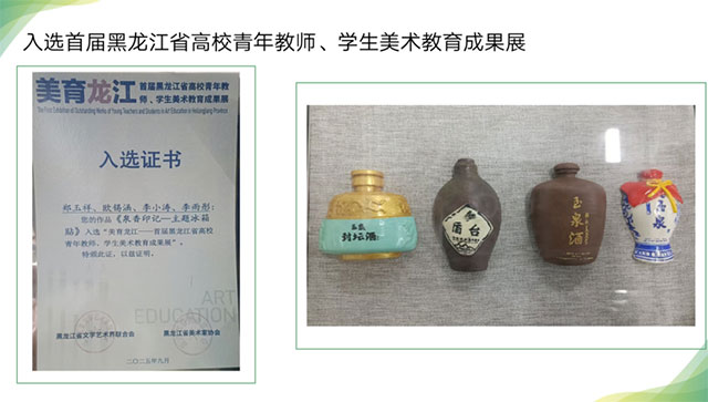 此次汇报中,李雨彤同学两项亮眼成绩尤为引人注目:作品《摆布》在首届黑龙江省 “勤廉龙江” 主题美术作品展中斩获优秀奖,以艺术语言传递勤廉正能量,展现了青年学子对社会主题的深刻理解与精准表达;阿城文创作品 —— 玉泉酒厂冰箱贴成功入选首届黑龙江省高校青年教师、学生美术教育成果展,将地域文化元素与实用美学巧妙结合,让文创作品成为承载本土记忆的鲜活载体。这两项荣誉的背后,凝结着李雨彤同学对艺术的热忱匠心与不懈探索,是她将专业学习与主题表达、文化传承深度融合的生动写照。
