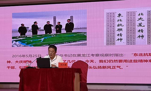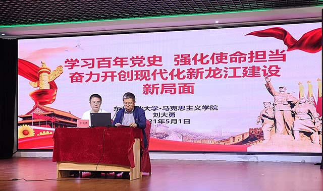 刘大勇教授在报告中以丰富详实的史料、生动的事例和珍贵的照片,为与会人员讲述了中国共产党百年奋斗的光辉历程。在宣讲中,刘大勇教授引用丰富的数据和史实,生动讲述我党在龙江大地的浴血奋战史、艰苦创业史、改革创新史和龙江的“抗联精神”“北大荒精神”“大庆精神”和“铁人精神”。刘教授的精彩宣讲,使大家受到了一次生动、深刻的党史教育和革命传统教育。与会师生表示,刘老师的讲座既是一堂讲述百年党史、强化责任担当的生动党课,更是一堂教育引导广大党团员知史爱党、知史爱国、知史爱社会主义的思政示范课。