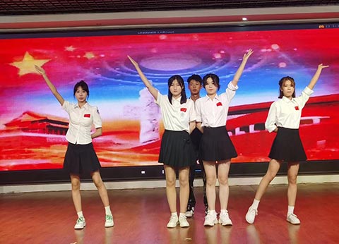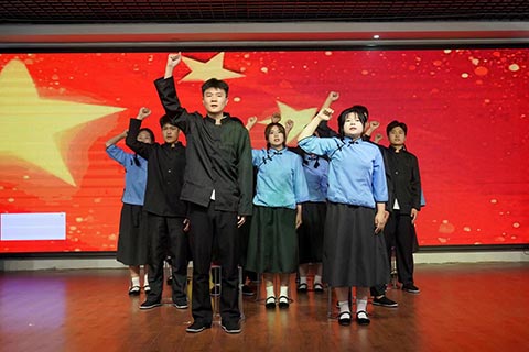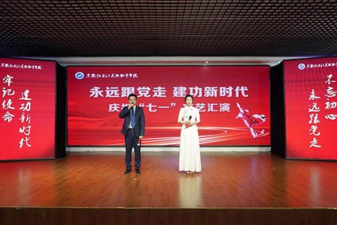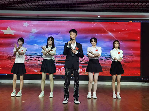 影视动画系雄浑激昂的大合唱《保卫黄河》拉开了整场演出的序幕,唱出了美院人砥砺前行,战胜一切困难的气势。美术教育系、专升硕考研学部、数字传媒系师生依次演唱的《众人划桨》、《强军战歌》、《我和我的祖国》抒发了他团结的意识,表达了他们爱国情怀。专升本国际学部教工自编自演的三句半《夸夸咱的党》用精炼的语言,明快的节奏,表达了对党的热爱,赢得了全体观众的满堂喝彩。影视动画系教工身着红军服装用心演唱《没有共产党就没有新中国》,台上台下齐声高唱,挥舞手中的红旗,将整场演出带入高潮。环境艺术系学生带来的情景剧《满江红》,精致的服装准备,精彩的视频背景,给人以强烈的年代感,将现场观众仿佛带进了战火硝烟、全民抗战的年代。勿忘国耻、振兴中华、强国有我的呐喊声响彻整个礼堂。由机关党支部殷新林创作的诗朗诵《校园里歌唱》,诗歌中:“用红黄蓝三原色作画,涂抹五颜六色的神奇风光;以德智体美劳五要素育人,输送祖国需要的栋梁”,将学院的办学理念演绎的淋漓尽致。最后,演出在《共筑中国梦》的歌声中结束,用歌声唱响爱国情怀,礼赞伟大祖国。整场演出以形式多样、内容丰富的节目歌颂了建党以来的丰功伟业和辉煌成就,以艺术的形式凸显了中国共产党奋斗、奋发、奋进的光辉形象,表达了对党和国家的无限热爱与感恩,展现了三江美院党员干部传承红色基因、赓续红色血脉,不忘初心、砥砺奋进的壮志与豪情。